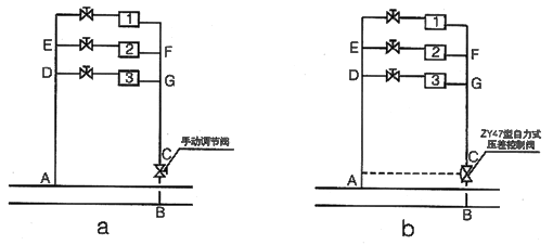 (1)對(duì)于具有多個(gè)支路的環(huán)路,裝設(shè)ZY47型自力式壓差控制閥,可以達(dá)到兩個(gè)目的:a、吸收外網(wǎng)的壓力波動(dòng),使被控環(huán)路的水力工況不受外網(wǎng)壓力波動(dòng)的影響。b、削弱各支路間的調(diào)節(jié)干擾(即一個(gè)支路的調(diào)節(jié)對(duì)其它支路的流量所產(chǎn)生的影響)。對(duì)于第a條是顯而易見的;對(duì)于第b條,這里與裝設(shè)手動(dòng)調(diào)節(jié)閥作一個(gè)對(duì)比分析。 如圖2a所示,對(duì)某環(huán)路裝設(shè)手動(dòng)調(diào)節(jié)閥,則當(dāng)環(huán)路的某個(gè)支路進(jìn)行調(diào)節(jié),比如第2個(gè)支路關(guān)閉時(shí),由于環(huán)路的總阻力增大,總流量減小,使手動(dòng)調(diào)節(jié)閥的壓降減小,導(dǎo)致施加于環(huán)路的壓差PA—PC增大,加之總流量的減小,又使環(huán)路干管AE和CF的阻力損失減小,從而使1、3兩個(gè)支路的壓差增大,流量增大。 (3)ZY47型自力式壓差控制閥(氮封閥)可與電動(dòng)調(diào)節(jié)閥配合使用。電動(dòng)二通調(diào)節(jié)閥的選型應(yīng)遵循兩個(gè)原則:A設(shè)計(jì)流量所對(duì)應(yīng)的開度為90%左右;B閥權(quán)度不小于0.3。多余A個(gè)條件往往難以滿足,因?yàn)橥环N電動(dòng)閥相鄰兩種口徑的流通能力大約相差60%,所以往往找不到流通能力恰好符合要求的口徑,而只好選偏大的口徑。這樣一來,一是可能造成較多的時(shí)間電動(dòng)閥在較小開度下工作,使閥的控制不穩(wěn)定、不精確;二是全開狀態(tài)不可避免(比如系統(tǒng)啟動(dòng)時(shí)以及大的干擾出現(xiàn)時(shí)),而全開將使被控負(fù)載出現(xiàn)過流。對(duì)于這種情況,一個(gè)簡(jiǎn)單的解決辦法是與電動(dòng)閥串聯(lián)一個(gè)平衡閥,消耗一部分壓差,從而使電動(dòng)閥在90%開度時(shí)為設(shè)計(jì)流量。但這種處理,有時(shí)會(huì)出現(xiàn)電動(dòng)閥的閥權(quán)度過小的情況,即閥工作時(shí)的壓差變動(dòng)范圍過大,造成閥的工作特性嚴(yán)重偏離理論特性,使控制的精確度變差。如果閥權(quán)度小于0.3,則可如圖3所示,與電動(dòng)閥串聯(lián)裝設(shè)一個(gè)ZY47型自力式壓差控制閥(平衡閥不再裝設(shè)),用壓差控制閥控制電動(dòng)閥的進(jìn)出口壓差,使之基本恒定。而外網(wǎng)的壓力波動(dòng)和負(fù)載的壓降變化,均由壓差控制閥吸收。 | |||||||||||||||||||||||||||||||||||||||||||||